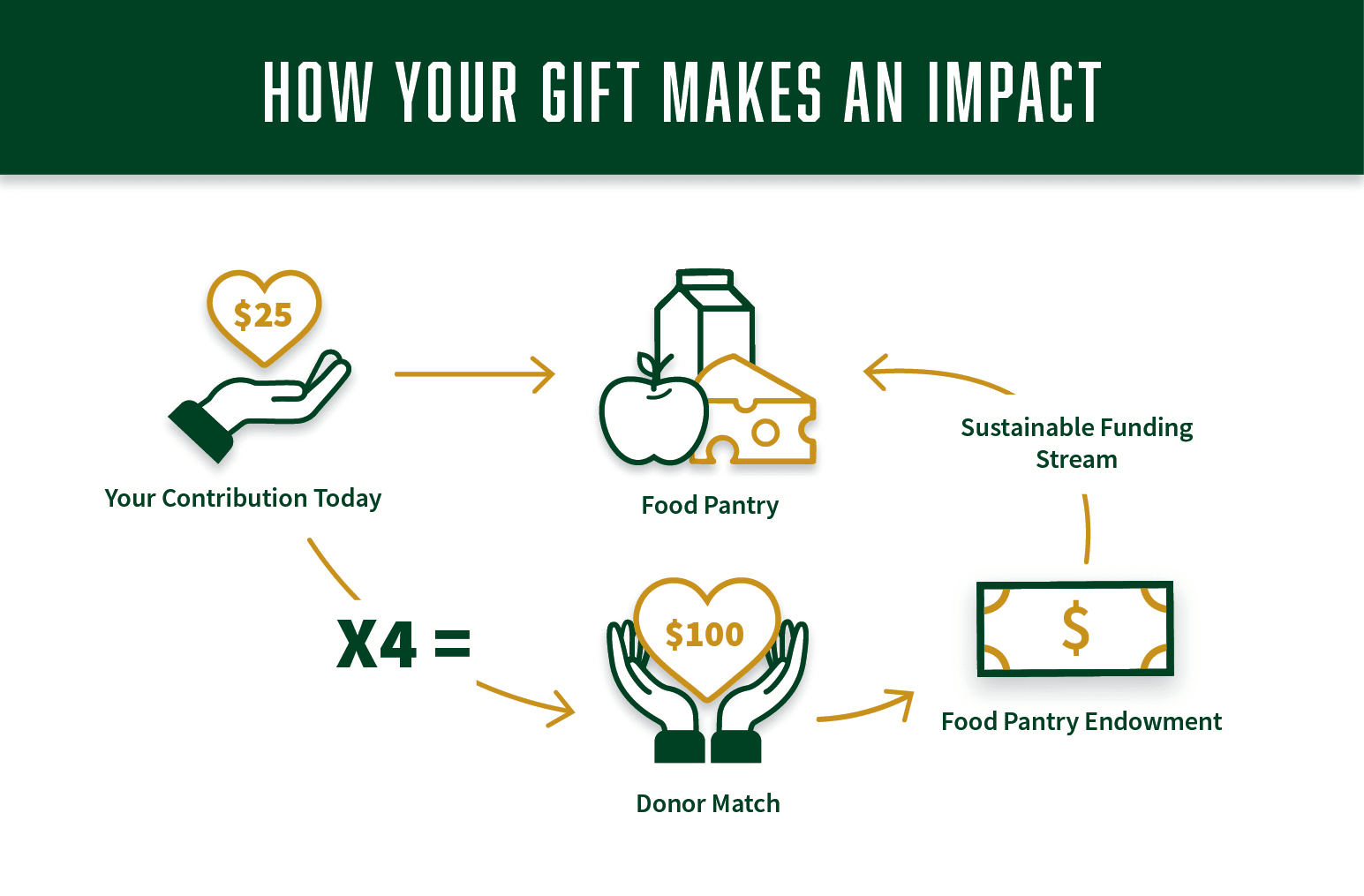 Help us reach our goal of $25,000 to support the Food Pantry today— and then for every dollar donated up to the goal amount, a generous donor will quadruple your gift and invest it in the new Food Pantry Endowment, securing the future of the Food Pantry!